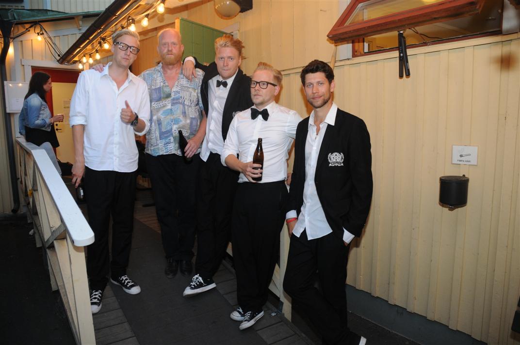 Hiphopgruppen Movits! träffade vi backstage efter SVTs ordinarie sändning av allsång på skansen slutat. De består av bröderna Johan och Anders Rensfeldt samt saxofonisten Joakim Nilson. De kommer från Luleå och har verkligen lyckats hitta ett unikt sound med en skön blandning av hiphop ,swing och visa. De kallar det för ”akustisk swing”. När Movits! spelar ute på mindre ställen klarar de sig själva, men när möjligheten ges tar de med sig några extra musiker som nu på allsången. Det kan också vara lite för kostsamt för arrangörer och lite trångt på scen med flera instrument.