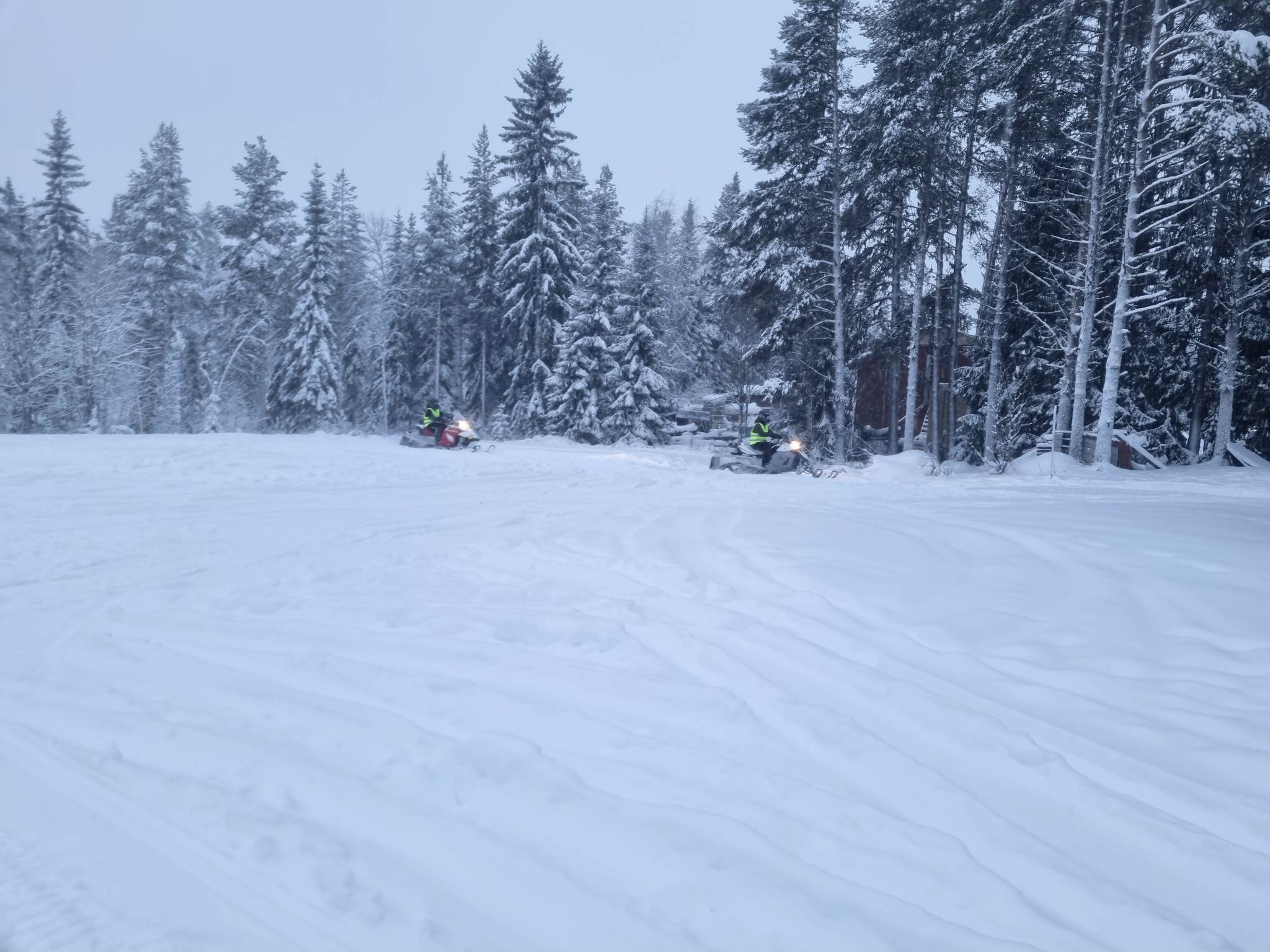 När 30 min hade gått körde vi ca en timme. Vi övade på att backa och köra, vi fick även köra med släde runt utbildningsstugan samt boningshuset. När vi kom till tomtens infart fick den symbolisera en riktig väg och skulle korsas enligt reglerna. Den som satt baktill fick kliva av och gå över medan skoterföraren körde över med skoter och släp. Det var lite fler övningar men det blir för mycket att berätta om här. När Anders sett att vi kunde hantera skotern hjälpligt så åkte vi c:a 500 meter skogsterräng till en myr han arrenderar från markägaren. Där skulle åka vi 40-50 km/t och tvärbromsa. Där var vi ca en timme till en och en halv för sedan åka tillbaka och fortsätta sista delen av teorin.