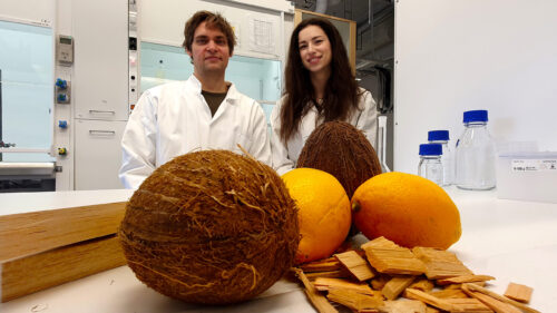 – När värme appliceras så omskapas citronbyggstenen till ett tvärbundet biobaserad plastmaterial runt och inuti den porösa trästrukturen, vilket på ett elegant sätt fångar kokosnötbyggstenarna i materialet, berättar Peter Olsén, forskare vid avdelningen Biokompositer på KTH.