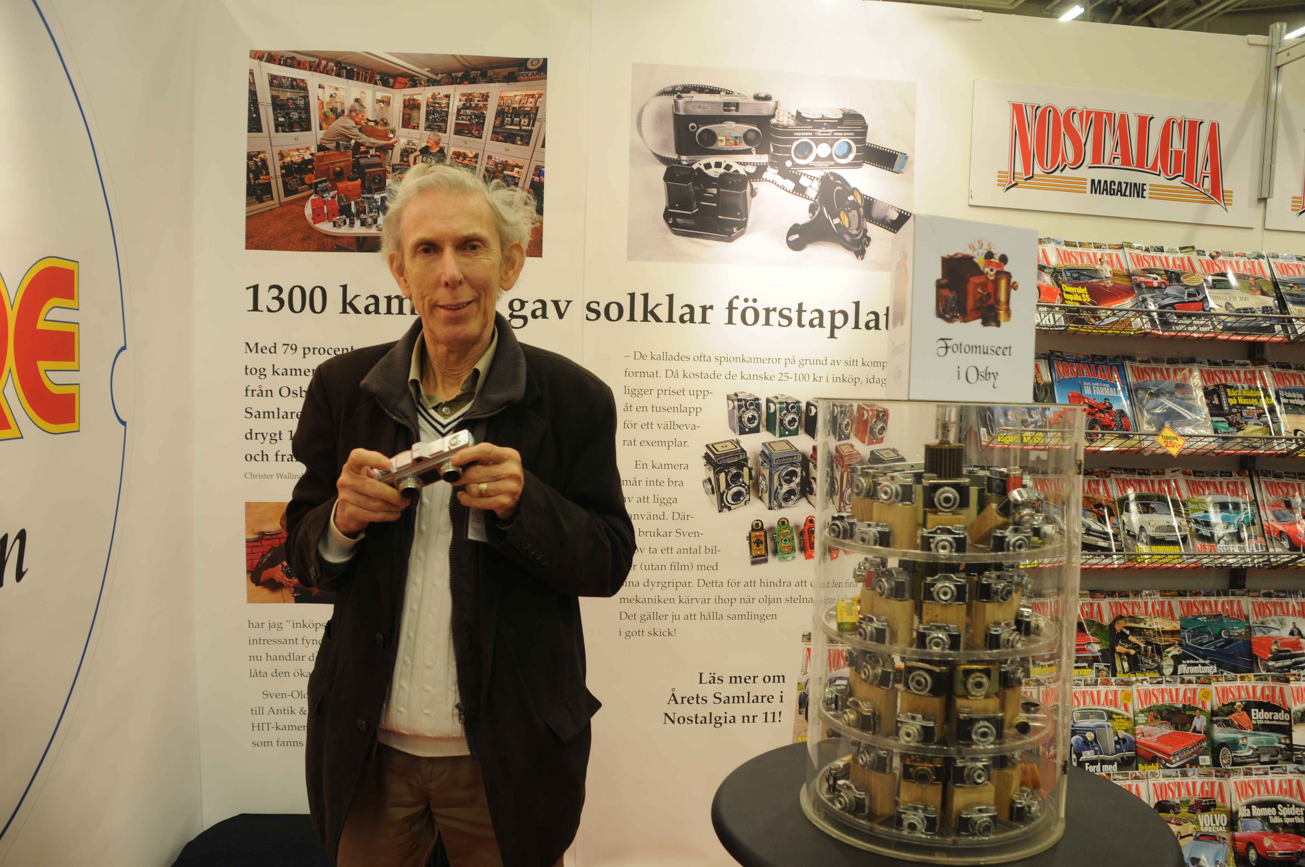 Några av de minsta prylarna hade Årets samlare fotografen Sven-Olov Sundin. Han hade tagit med sig en liten del av sin fina exklusiva kamera samling på över 1300 stycken som normalt finns på hans eget Fotomuseum i Osby. Det har han förutom sin fotoaffär. Han hade tagit med sig ett stort antal av små s k Hitkameror från 50-talet. De blev väldigt populära efter kriget när japanerna började massproducera det mesta billigt. Då kostade en sån här kamera 5, 10 eller upp till 50kr ! Och den gick ju att fota med också. Det känsligaste var filmbyte som behövde ett visst mått av försiktighet. Nu får man säkert ge 500kr eller 1000kr för en sådan kamera.