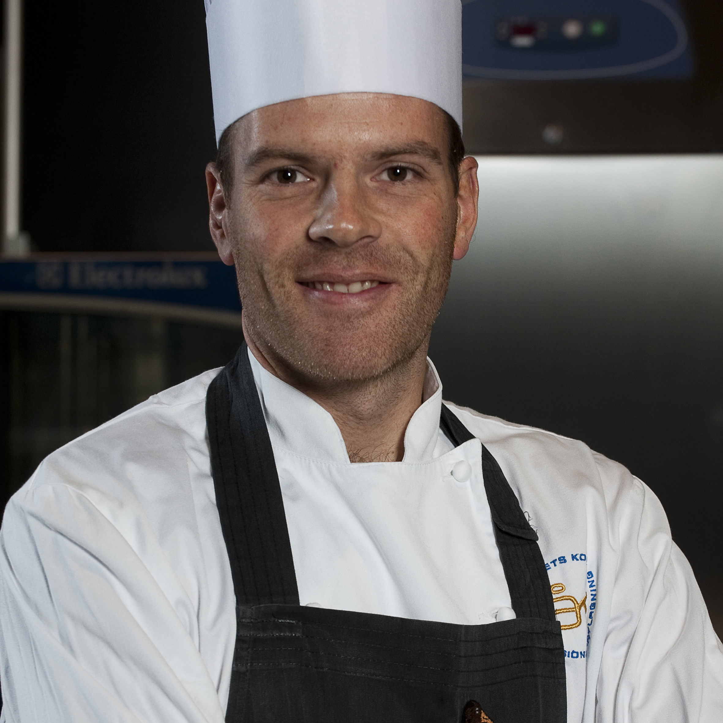 Jakob Lells är 36 år, arbetar på Skanörs Gästgifvaregård och vann dagens semifinal med rätten Odlad piggvar med blomkål, gurka och vattenkrasse.