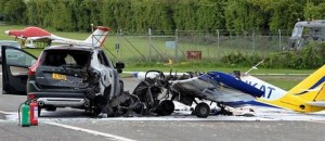 I landningsbanans utkant färdades två personer i en Volvo XC60. Planet, en enmotorig AT3-modell, lyckades träffa Volvon i sidan. Planet krossades och ett stort eldklot uppstod vid kollisionen. Trots detta kunde de två personerna i Volvon kliva ur bilen utan en skråma. De hjälpte dessutom den svårt skadade piloten ut ur flygplansvraket. Som tur var befann sig ett team med brandmän vid den avstängda delen av flygfältet. De var på plats för att övervaka en dragrace-tävling.