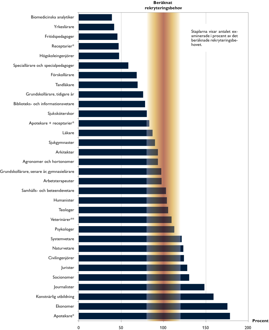 Tillgången på biomedicinska analytiker beräknas nästan halveras under de kommande femton åren, framför allt på grund av stora pensionsavgångar, samtidigt som efterfrågan kommer att öka. Även antalet tandläkare fortsätter att minska kraftigt. Trots en viss utbyggnad av tandläkarutbildningen räknar Högskoleverket med att bristen kommer att vara fortsatt stor. Andra bristgrupper är yrkeslärare, högskoleingenjörer, förskollärare och fritidspedagoger.