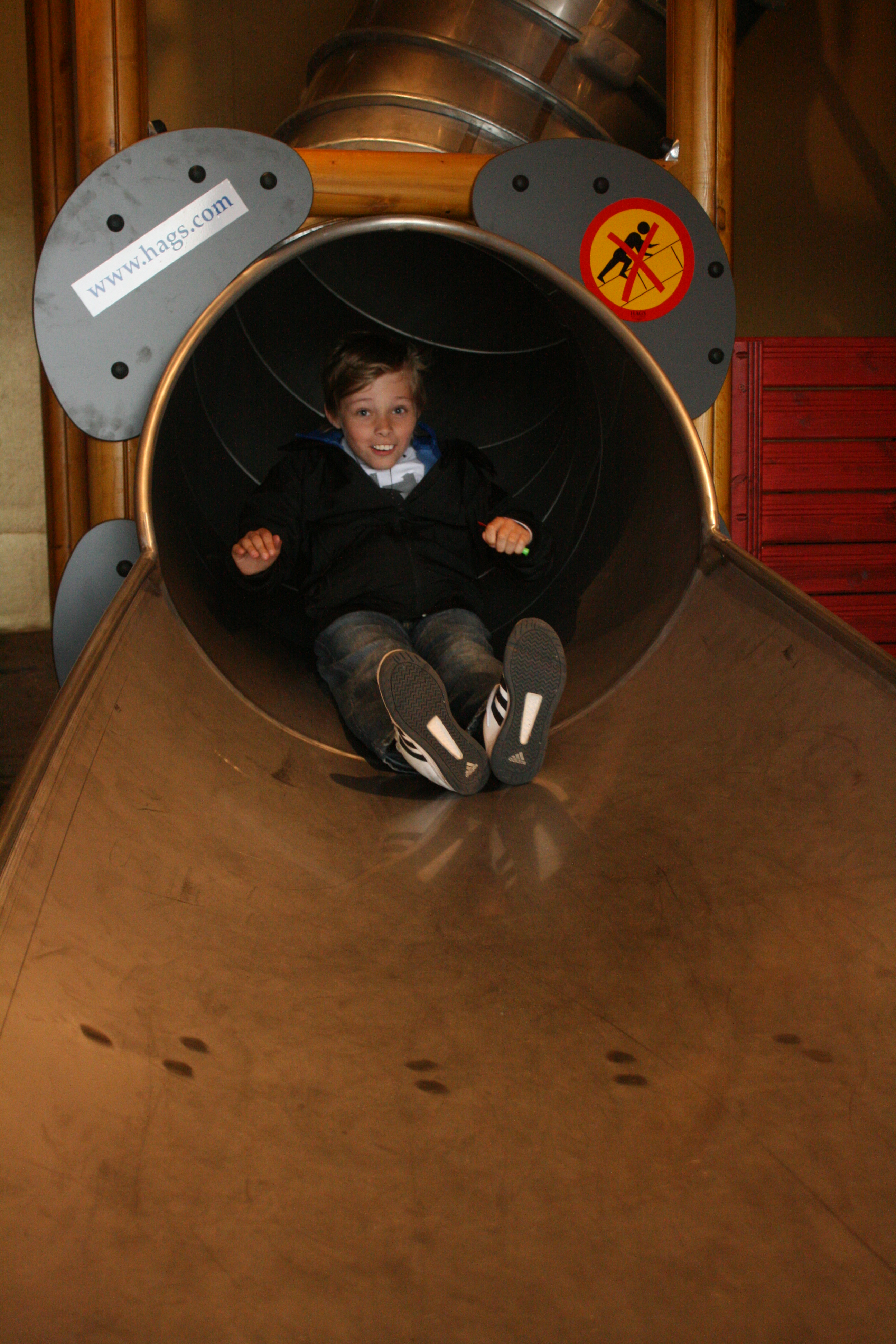 Adam, 10 år, var en av de många barn som gick på utställningen med sina föräldrar och prövade på rutschkanan.
